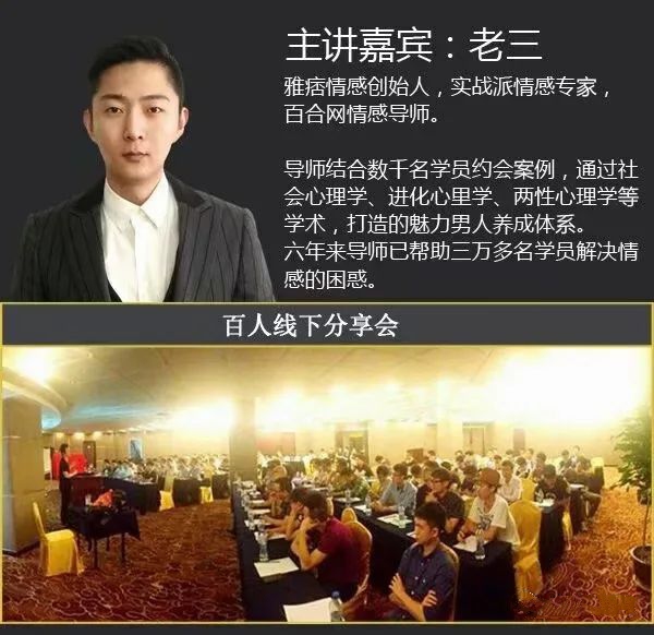 导师结合数千名学员约会案例,通过社会心理学、进化心里学、两性心理学等学术,打造的魅力男人养成体系,六年来导师已帮助三万多名学员解决情感的困惑。