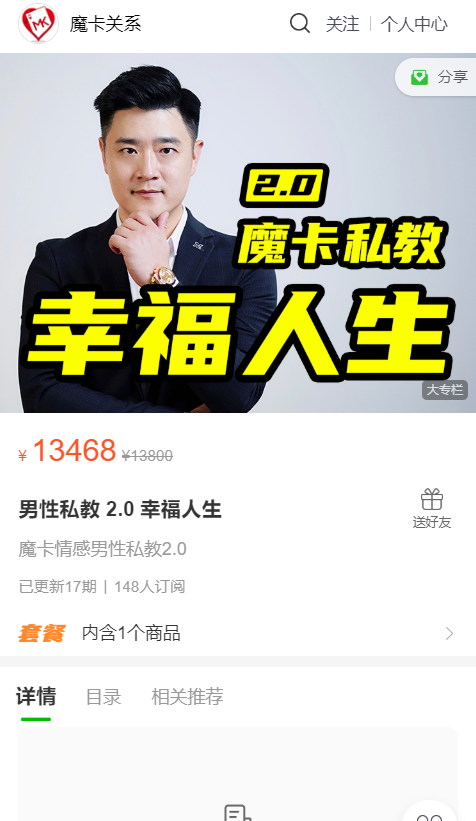 魔卡私教2.0《幸福人生》是一套系统的恋爱教学课程,旨在帮助学员掌握恋爱的核心本质和技巧。该课程强调正能量恋爱,并提倡价值和能量是吸引女生的核心。
