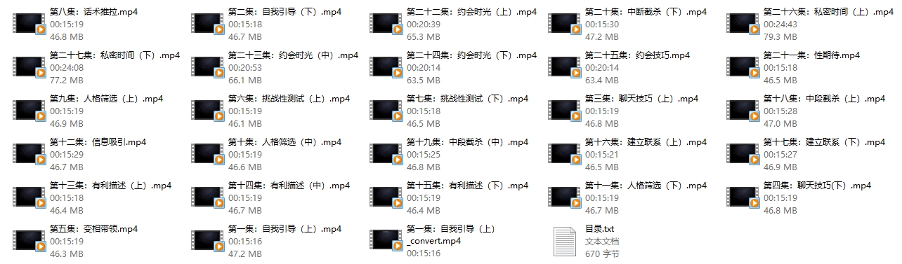 此外,该课程还包括了27集的视频内容,主要讲解了聊天技巧,并且加入了恋爱契约、约会时光、私密空间等内容。这些课程旨在帮助用户提升恋爱中的沟通技巧和情感管理能力,适合那些希望在恋爱关系中取得进步的人士学习使用。