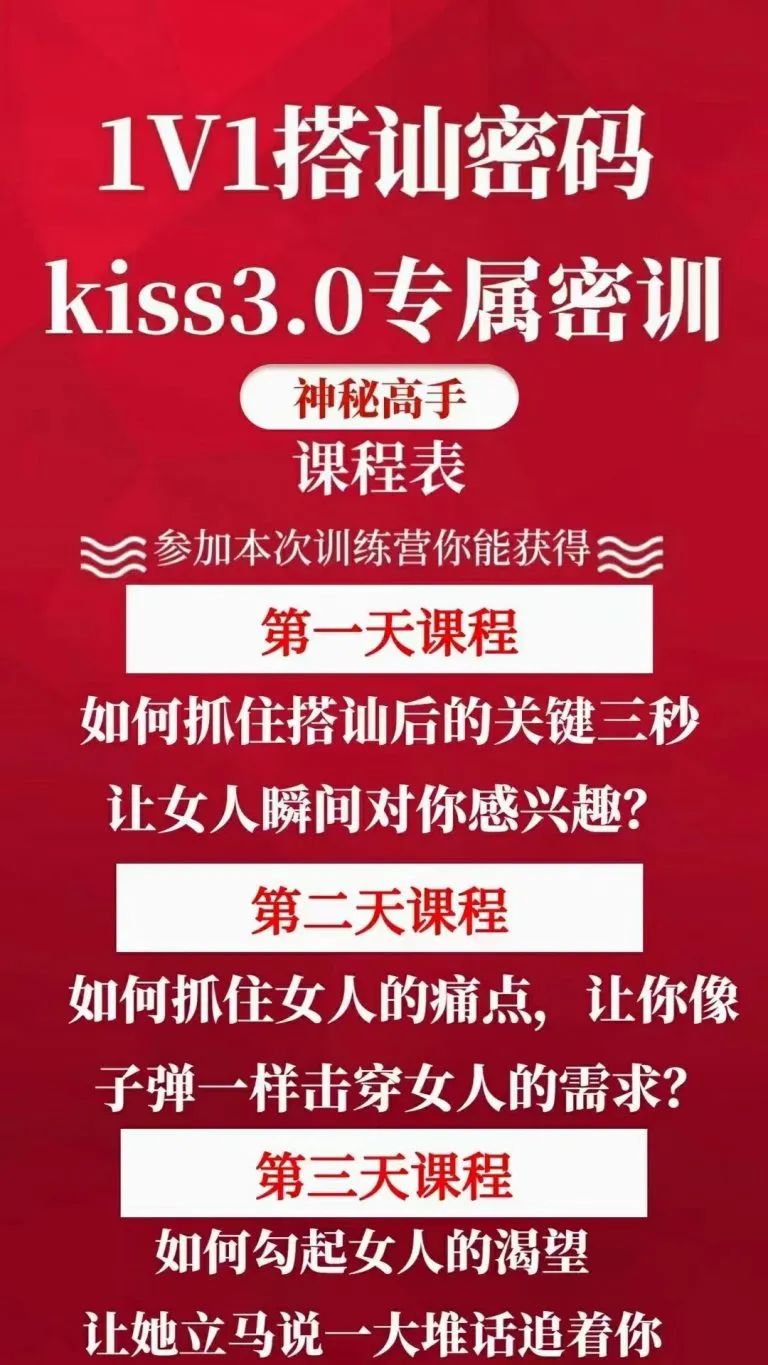 《马克搭讪KISS 3.0》是一门专注于社交技巧和搭讪艺术的实用指南,旨在帮助读者在社交场合中更加自如地展现自己,建立良好的人际关系。该课程从实操搭讪开始讲起,教你搭讪时要注意的事情以及私教一对一的教程。课程内容包括如何像子弹一样击穿女人的需求,如何让女人说一大堆话并疯狂追你,制造身临其境的幻觉让女人只任你一个人。