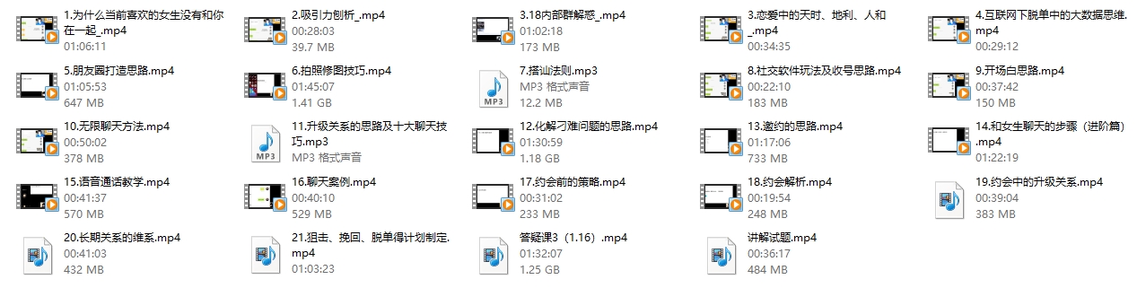 大橙1.0《脱单必修》是一套系统的撩妹脱单课程,旨在帮助学员从零开始学会正确谈恋爱、快速收集女生资源和搭讪技巧等内容。该课程包含脱单、挽回、狙击等计划制定课程,涵盖了如何提高自身魅力、吸引力剖析、恋爱中的天时地利人和等多个方面。课程目录包括为什么当前喜欢的女生没有和你在一起、吸引力剖析、恋爱中的天时地利人和等内容。此外,课程文件总计10.8 GB。