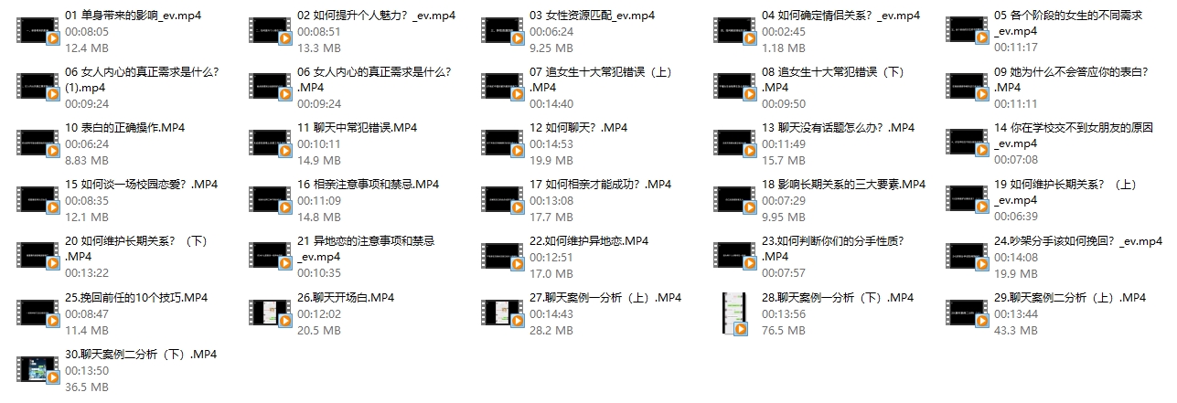 课程分为多个板块,从改变自己到认识女生,再到了解女人,最后达到相爱的阶段。具体目录包括单身带来的影响、如何提升个人魅力、女性资源匹配、如何确定情侣关系以及各个阶段女生的不同需求等。