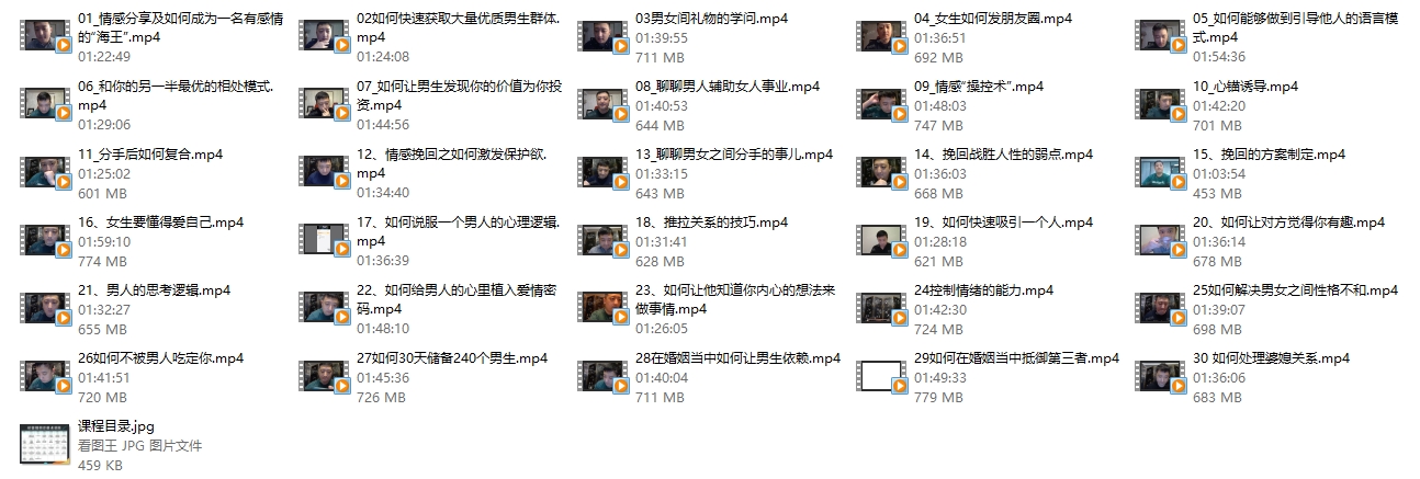 这套课程共有30节视频实操课程,总大小为19.13G。通过这些课程,参哥分享了简单有效的恋爱技巧,帮助学员在情感关系中取得成功。