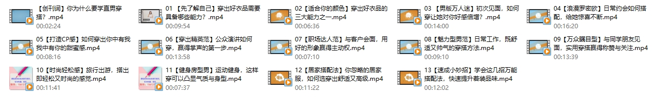 总之,《男士衣品拯救指南,快速提升你的穿搭高级感!13节视频课【完结】》是一套全面且实用的穿搭课程,适合希望提升个人形象和穿搭水平的男士们学习和参考。