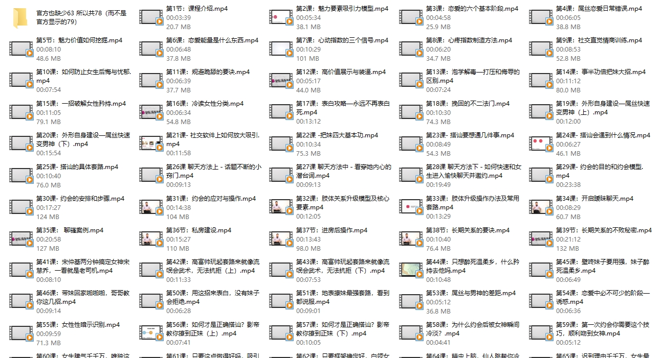 这套课程共有77节或78节课(不同来源有轻微差异),内容非常详细且实用,涵盖了从情感聊天到感情升温、情感挽回以及婚姻危机等多个方面。课程内容包括如何重建自己的吸引力、调动女人的情绪、建立属于自己的框架等。