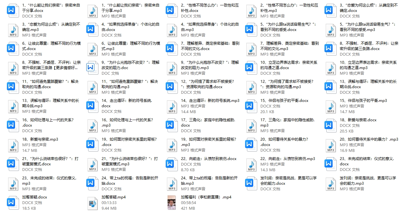 总之,《李松蔚亲密关系24讲:探索关系之道,把握幸福主动权(完结)》是一门非常实用且全面的课程,适合所有希望改善和提升自己在亲密关系中表现的人士学习。