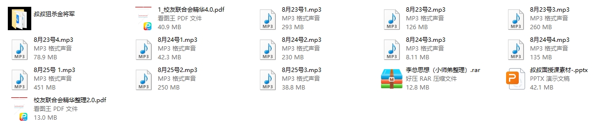 课程的录音资料已经整理完毕,内容劲爆且十分珍贵,因此线下课非常难得。课程目录包括了诸如“校友联合会精华4.0.pdf ”、“叔叔狙杀金将军”等内容,这些资料可以帮助学员更好地理解和应用课程中的知识点。