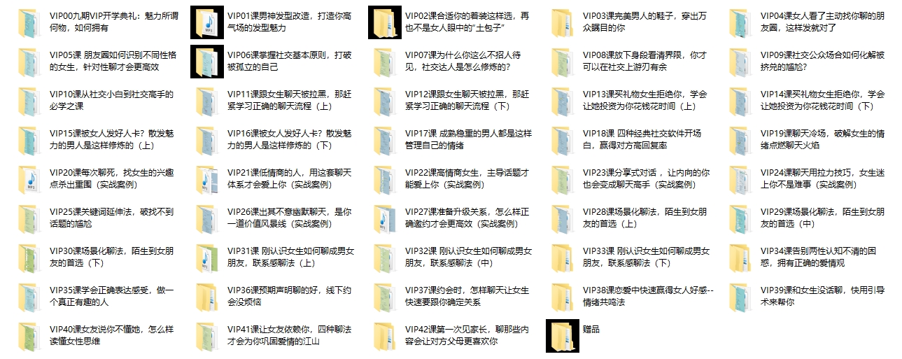 总体来说,《素云九期VIP脱单特训班》是一套非常适合新人入门并希望快速脱单的实战课程,通过系统的学习和实践,学员能够显著提升自己的恋爱技巧和自信心。
