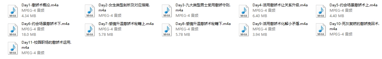 课程内容丰富,涵盖了从基础到高级的各种撒娇技巧。例如,第一天会介绍撒娇术概论,帮助学员理解真正的撒娇是什么;第二天则进行女生类型分析,让学员了解自己适合的撒娇方式。此外,课程还涉及不同场景下的撒娇应用,如校园、职场等,并提供了具体的案例和练习方法。