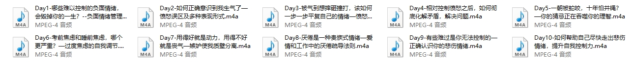 Chic情绪毒瘤治愈术是一套旨在帮助人们管理和控制负面情绪的课程。该课程通过一系列的音频文件,详细讲解了如何识别和处理各种负面情绪,以提升个人的情绪管理能力。