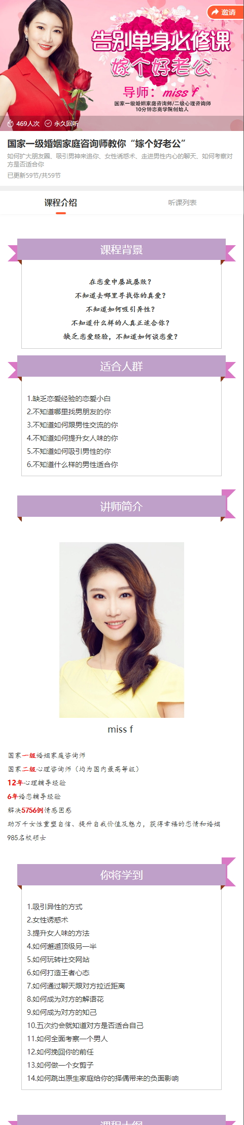 国家一级婚姻家庭咨询师miss f教你如何扩大‮友朋‬圈、吸引男神‮追来‬你、女性‮惑诱‬术、走进男性内心‮聊的‬天、如何‮察考‬对方是否适合你。‮到找‬自己的幸福‮侣伴‬。