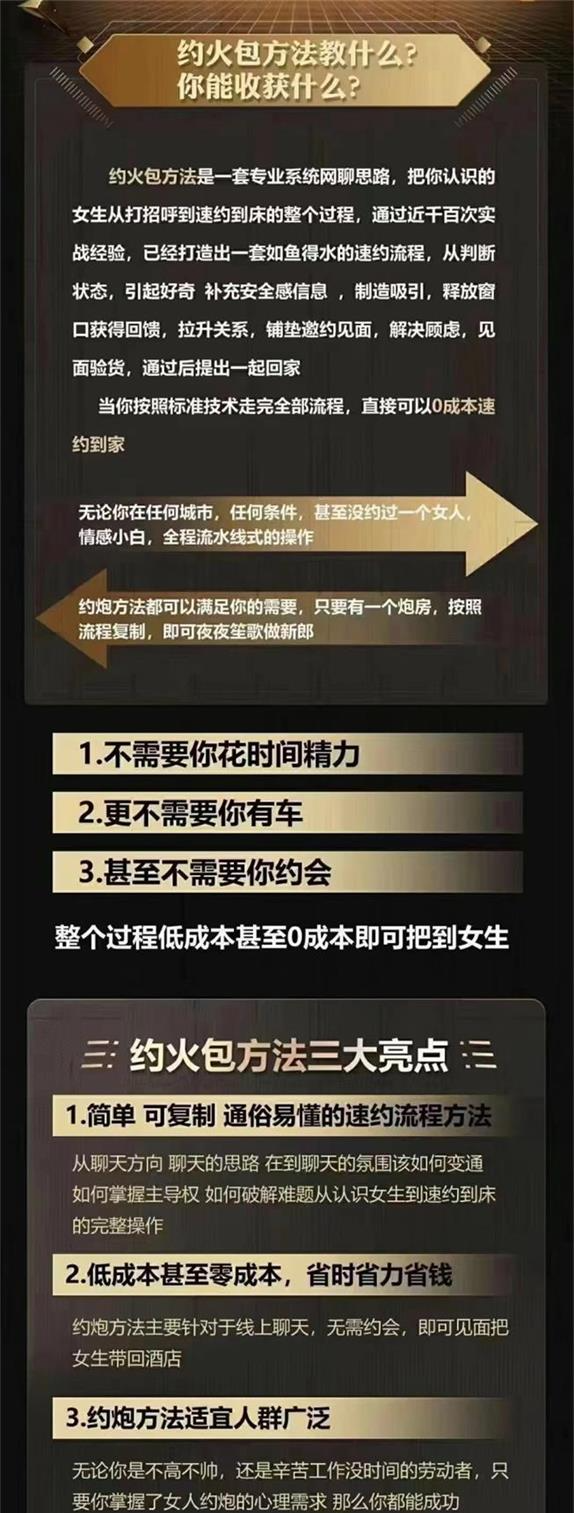 约火包方法是一套专业系统网聊思路,把你认识的女生从打招呼到速约到床的整个过程,通过近干百次实战经验,已经打造出一套如鱼得水的速约流程,从判断状态,引起好奇补充安全感信息,制造吸引,释放窗口获得回馈,拉升关系,铺垫邀约见面,解决顾虑,见面验货,通过后提出一起回家
