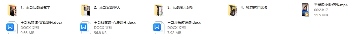 此外,课程还提供了详细的文档和视频资源,包括《王哥形象改造课.docx》、《王哥浪迹世纪PK.mp4》以及《王哥私教课-实战部分.docx》等,帮助学员从理论到实践全面掌握社交新玩法。