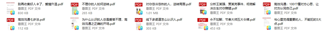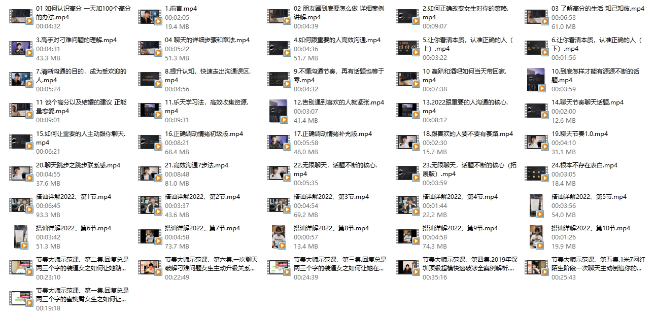 课程内容丰富,包括多个PDF文件和视频教程,涵盖了如何建立自信、吸引心仪对象、保持良好形象以及高效沟通等实用技巧。此外,课程还涉及如何应对感情中的各种复杂情况,例如处理忽冷忽热的情感问题和解决女生劈腿的问题。