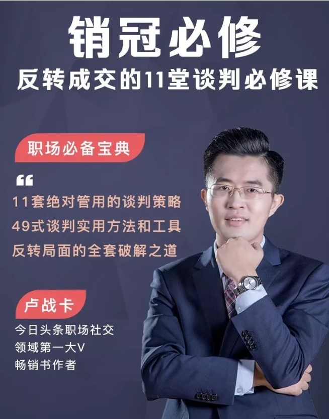 如果你从事的是销售或者商务岗位,谈判技巧能极大影响业务收入。那你一定不能错过这个500强上市企业销售内训师倾力打造的谈判术课程。签单百万的销售大神不会告诉你,令客户快速买单必备谈判诀窍,卢战卡老师将会全部为你拆解,让你不再被客户打击和拒绝!