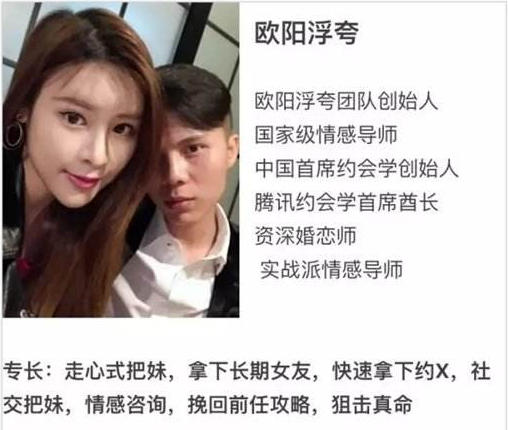 《欧阳浮夸约会学》创始人,,腾讯约会学部落首席酋长。现任《神撩术1.0》课程主导师,2011年偶然接触约会学,迷上把妹技能提升