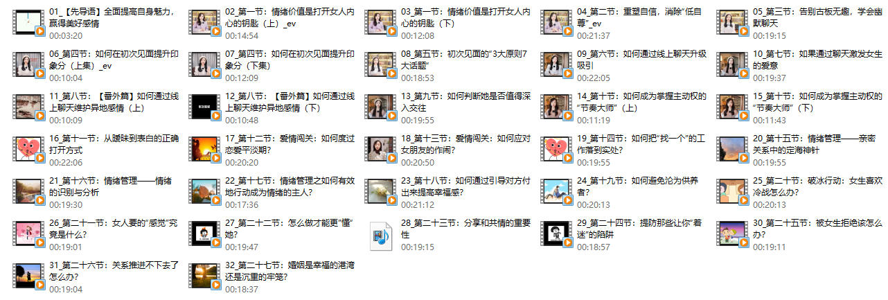 我们的课程分为三大板块,分别是第一魅力男性之成长宝典,这部分课程,我将指引你如何培养积极的思维方式,从而变得在女人眼里更有担当,有责任心,如何提升幽默感,脱掉古板无趣的外衣,让异性觉得你有趣好玩,如何变得更加成熟,不再幼稚懵懂以及如何进行形象管理,从外在上提升自己,给异性留下一段美好的第一印象,以及如何自我激励,除去低自尊感,建立强大的男性自信心。第二部分是魅力男性之脱单秘籍。这部分课程,我将指引你从认识异性到如何关系升级,如何度过暧昧期恋爱期巩固期。那么每个阶段都有它对应的基本原理,实操技巧或实战案例,让你知道原来恋爱也可以这么谈。第三是魅力男性之婚姻绝招,这部分课程我将指引你如何精准的洞察婚姻中出现的种种问题,如何睿智的决断婚姻是否要继续拥何巧妙的修复与妻子的感情,让她更加爱你。如何轻松合理的让2+1风轻云淡不再纠缠。俗话说,你若盛开蝴蝶自然通过学习这套课程,我们坚信只要你具备积极的心态,勇于自我尝试与自我突破,你就一定能够塑造出自己的专属男性魅力,变得更加阳光更加自信,拥有甜蜜的爱情和幸福美满的婚姻。